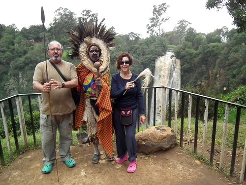 miradores para contemplarlos. Y al borde de ellos, varios masais, o de otras tribus, ataviados con sus pinturas de guerra, bailando una danza guerrera. Muy turístico y muy puesto para la ocasión. Éste se ganó los 300 chelines que le dimos entre los dos (nos pidió 100 a cada uno). Seguro que quitarse la pintura de la cara le cuesta mas. El video, ya lo ven, yo plantado allí creyendo que nos iban a hacer una foto y Maribel que no paraba de moverse. Luego empezó a diluviar y nos refugiamos en la furgoneta sin comprar nada siquiera. |
